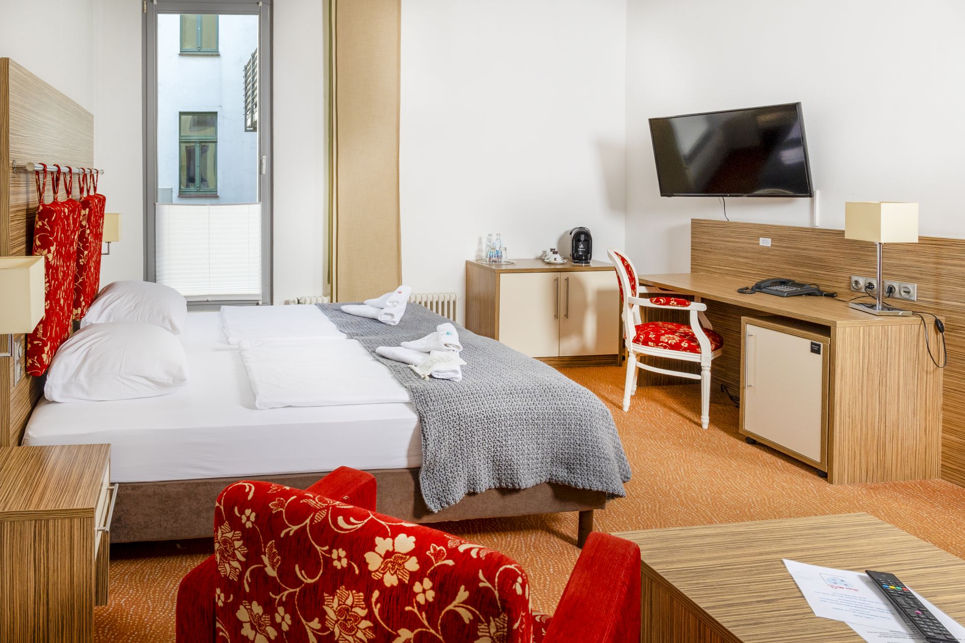 Genießen Sie in unseren stilvoll maritim eingerichteten Einzel- und Doppelzimmern den einzigartigen Ausblick wahlweise zur Altstadt oder zum Strelasund. Bitte beachten Sie, dass in diesem Zimmer kein Zustellbett verfügbar ist.
